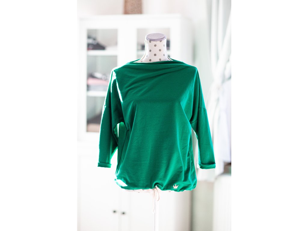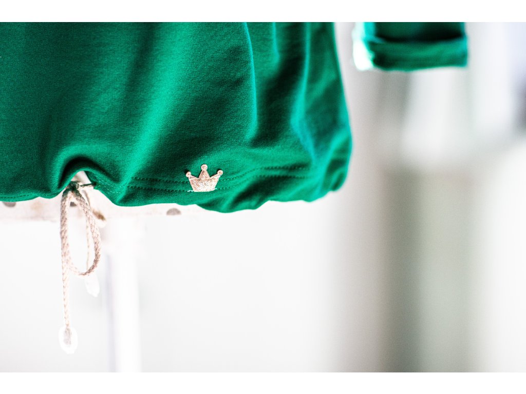 Jemná, střihem propracovaná mikina v zelené barvě, která tě svým střihem pohladí po duši a je zdobená jemnou korunkou Knoppka.